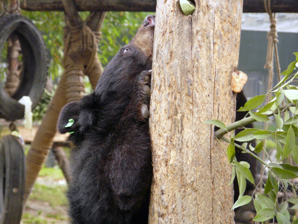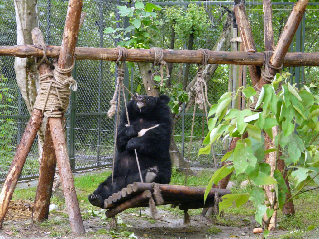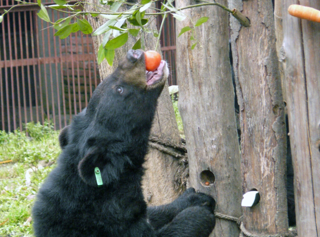 THE BELL RINGS AT 9 A.M. at Animals Asia’s Chengdu sanctuary. The doors separating the moon bears’ indoor dens from their grassy enclosures open at once. The creatures lope into the sunshine in search of treats: For the past hour, sanctuary employees have been hiding fresh goodies—apples, tomatoes, cabbages, carrots—inside tractor tires, on top of playground equipment, and in niches drilled into wooden logs.