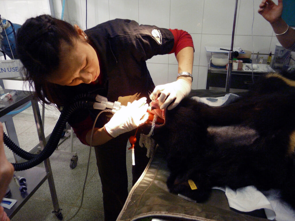 As she prepares for surgery, veterinarian Monica Bando checks the intubation tube on a recently freed 216-pound moon bear named Monkey, who was rescued with nine other bears from a bile farm in China’s Shandong Province.